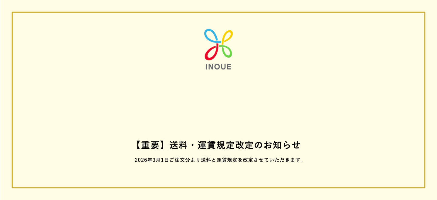 いつもINOUEオンラインショップをご利用いただき、誠にありがとうございます。このたび、配送会社の運賃改定に伴い、2026年3月1日ご注文分より送料と運賃規定を改定させていただきます。